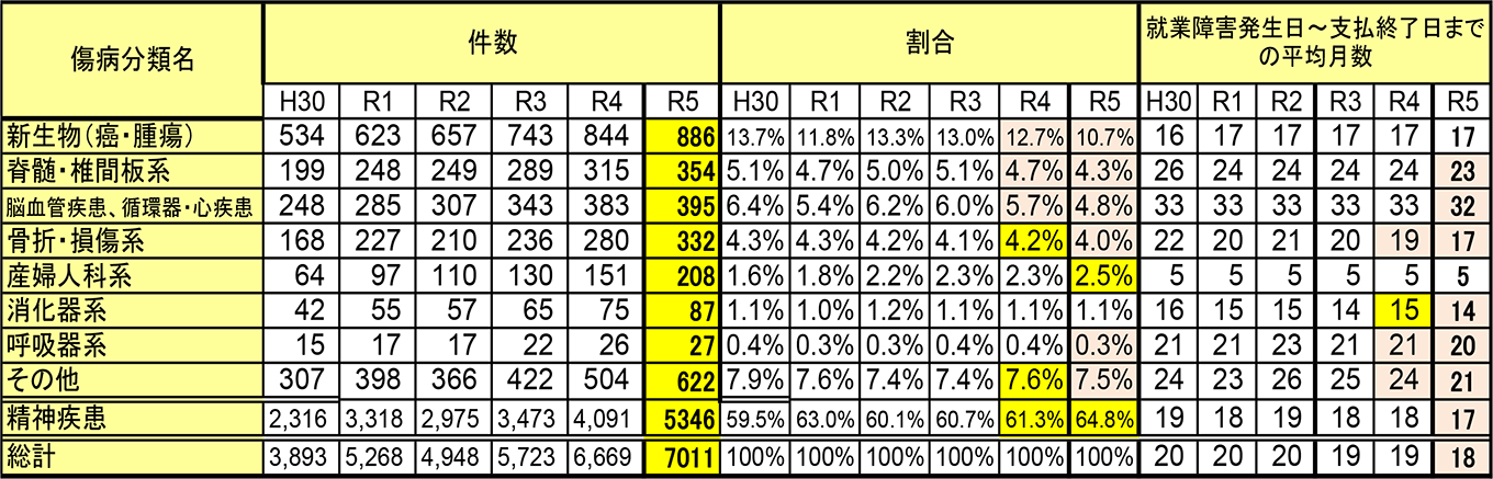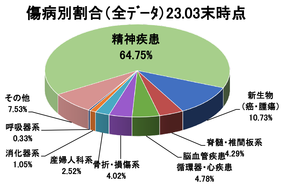 - 長期療養の具体的な疾患として、精神疾患・悪性新生物(がん)と心疾患・脳血管疾患を含む循環器系疾患が多く、 長期療養となった疾患のうちの約78%を占めます。